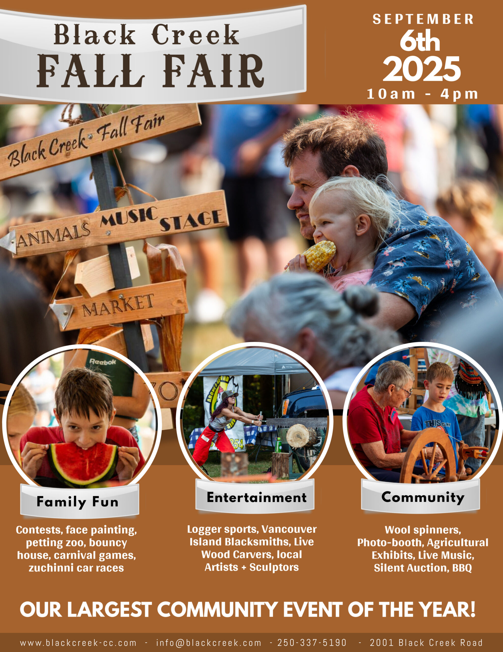 Come and celebrate the start of the fall season at the annual Black Creek Fall Fair! This family friendly, community festival is fun for all ages. The activities include live entertainment, craft and food vendors, petting zoo, kid’s carnival, competitions and community contests and more – all with a focus on rural and agricultural lifestyle.